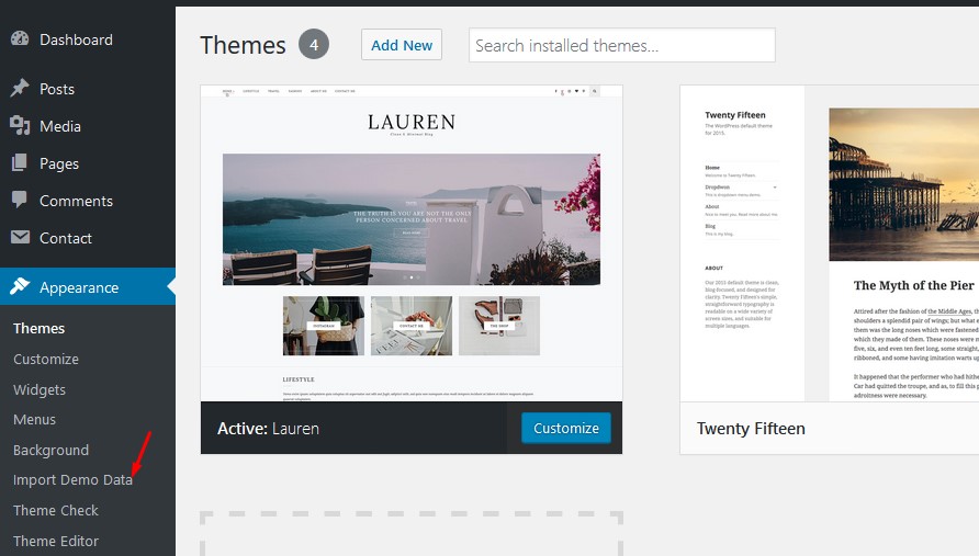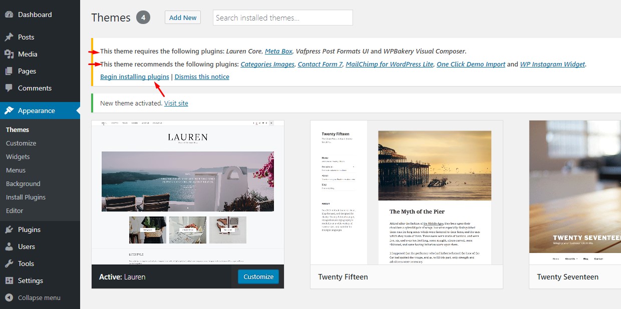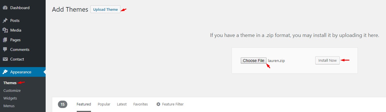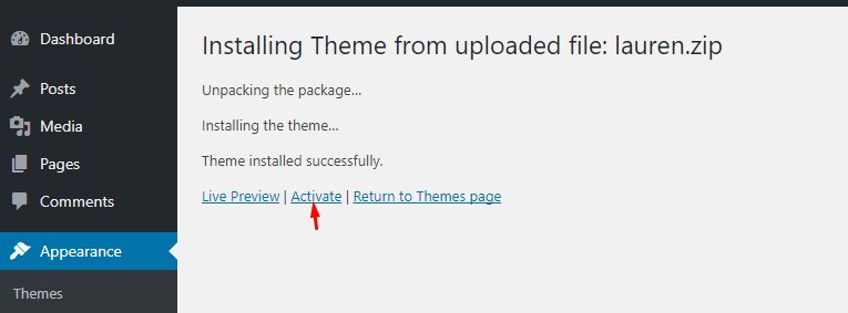WordPress: Navigate to Appearance -> Themes -> Add New -> Upload page. Select lauren.zip file.